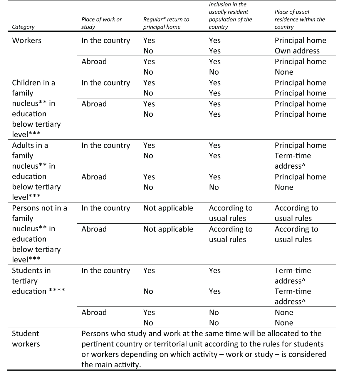 780. Table 3 summarizes the recommended guidelines of classification for students and workers who live away from the principal home for 12 months or more. For the sake of conformity with the global Principles and Recommendations for Population and Housing Censuses – Revision 4 issued by UNSD, students in tertiary education should be allocated to their term-time address, when studying within the country. When studying abroad they should not be included in the population of the country of their principal home, since their place of usual residence should be the term-time address in the country where they study, even if they regularly return to the principal home. However, it is acknowledged that in some countries there may be considerations (such as higher coverage during field enumeration, or a particularly large number of emigrating students) that would justify the allocation of these students to their principal home.